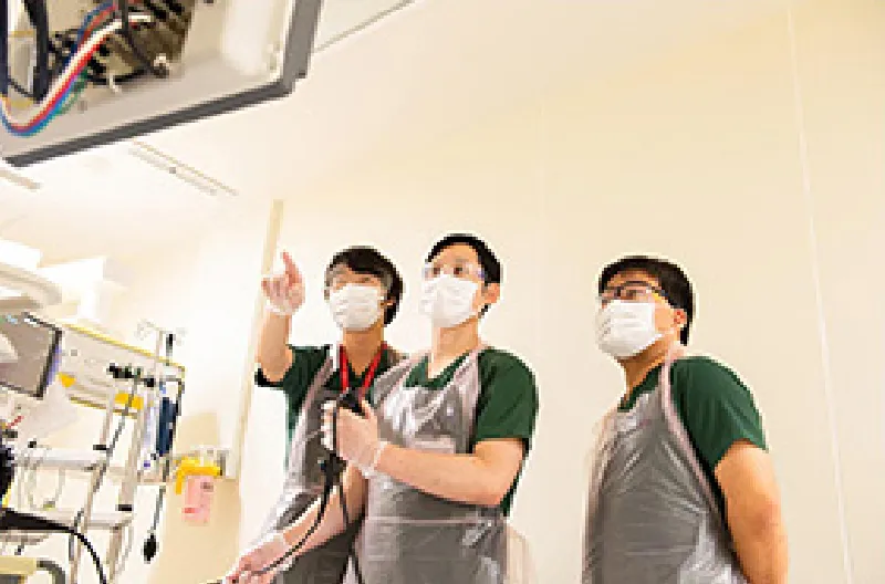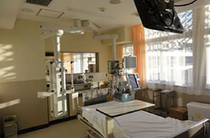 集中治療センターでは、重症患者を管理するにあたり、人工呼吸管理をはじめ、持続的血液ろ過透析や血漿交換、エンドトキシン吸着療法、体外式膜型人工肺などの体外循環装置や大動脈内バルーンパンピングなどの循環補助装置といった高度生命維持装置を必要に応じて導入し、重症患者さんの予後改善に努めています。また、理学療法士や看護師が中心となって、人工呼吸管理中からの早期のリハビリテーションも行っており、短期的のみならず、長期的な患者予後の改善に向けて取り組んでいます。ICU専従医はスタッフ3名、レジデント2~3名が24時間体制で治療に当たっています。また、当院では臨床工学技士も24時間の勤務体制をとっており、高度生命維持装置導入への迅速な対応が可能です。